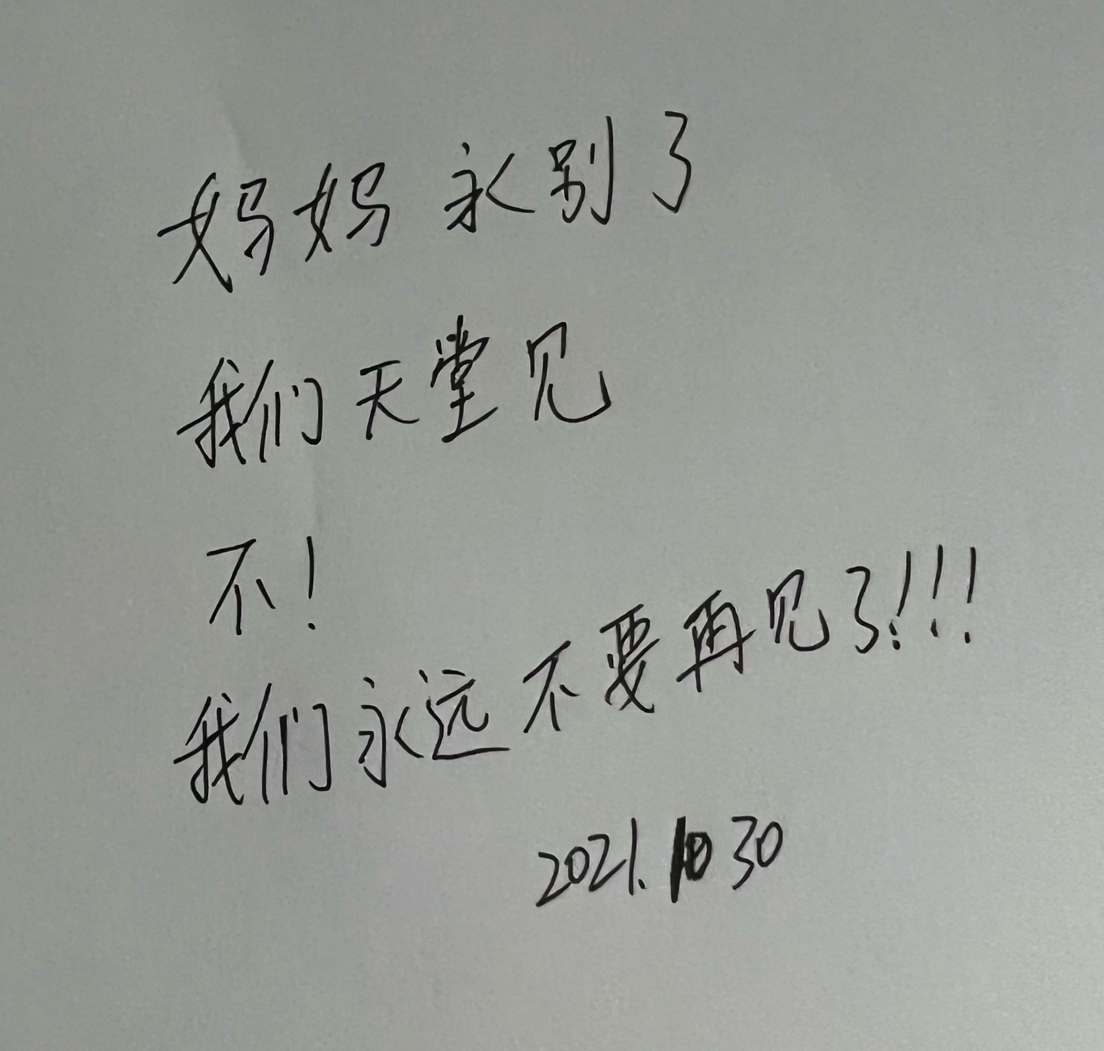 在2021年10月30日上午,秒秒老师收到一个求救的留言:“秒秒老师请您赶快救救我的孩子吧!我14岁的儿子要永远离开我了”。秒秒老师正准备要开会,问她怎么回事?她说:“我的孩子不见了,留下了一个告别遗书:“妈妈永别了,天堂见! 不! 我们永远不要再见了!!!”