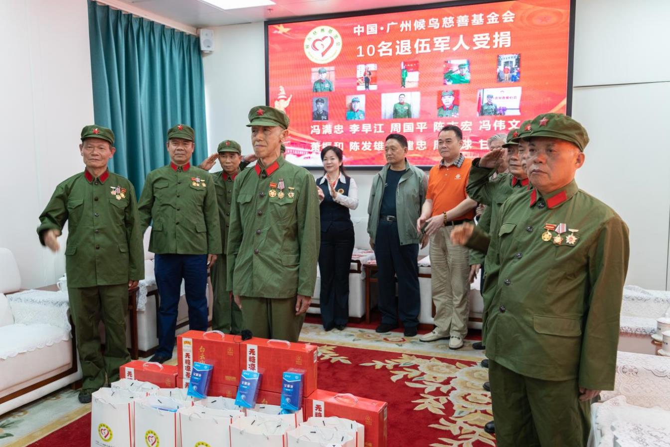 今年是纪念1979年西南边境作战胜利44周年,本次答谢会,广州候鸟慈善基金会联合广东爱国拥军拥军促进会、广州壹加壹爱心会、好家女人扶智助学委员会,一起举行了致敬慰问10名参战立功老兵(冯满忠、周沛球、陈志宏、萧振和、冯伟文、冯建忠、周国平、甘锦华、李早江、陈发雄)活动。活动组委会为他们送上了社会爱心企业家们捐赠的慰问金和慰问品。
