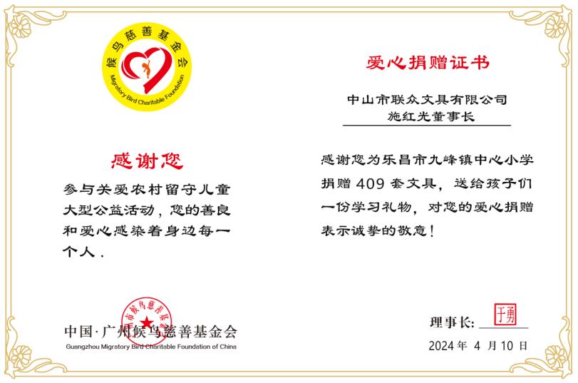 为了表达对中山市联众文具有限公司施红光董事长的感谢,于勇理事长为施红光董事长颁发了《爱心捐赠证书》。