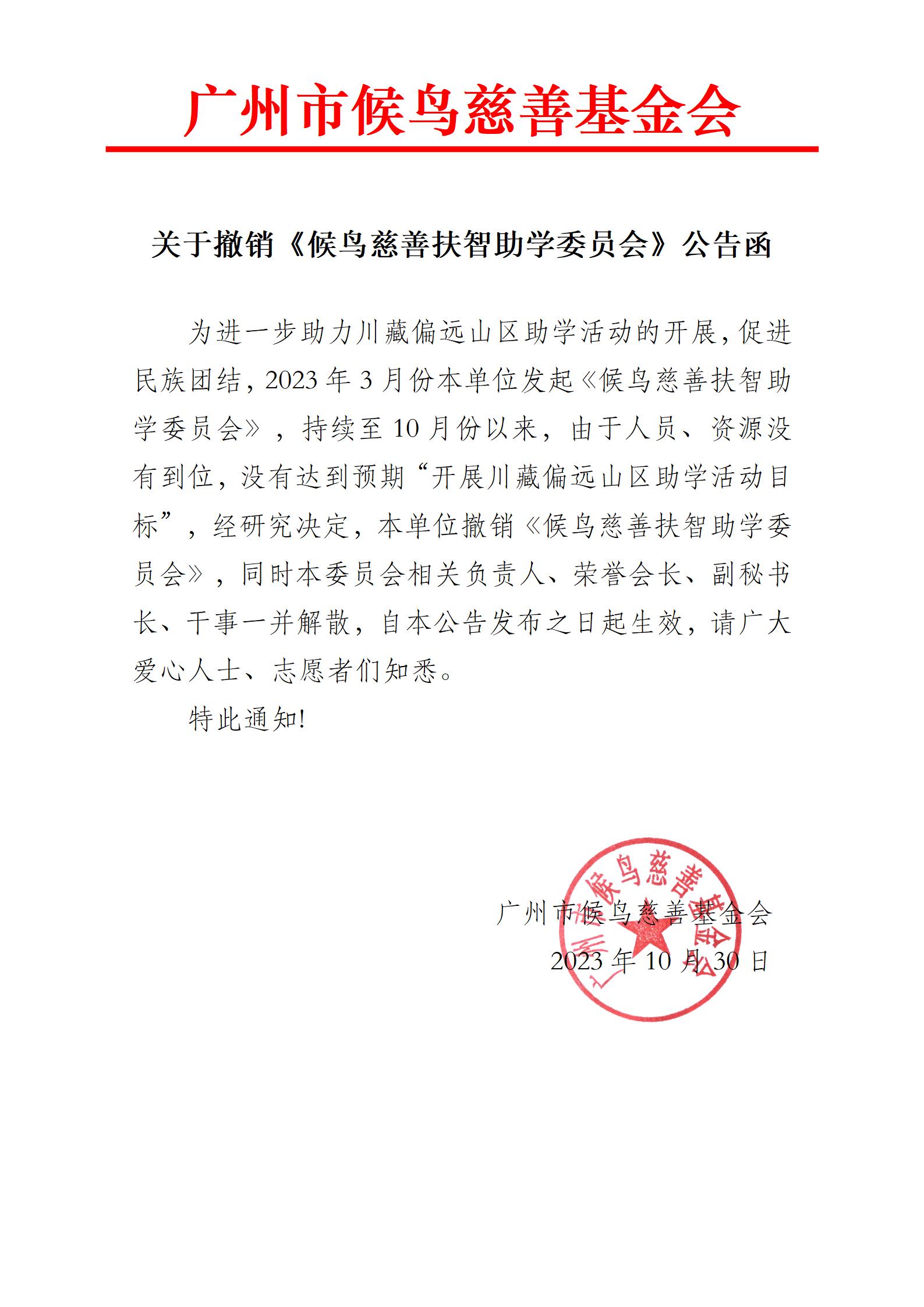 关于撤销《候鸟慈善扶智助学委员会》公告函