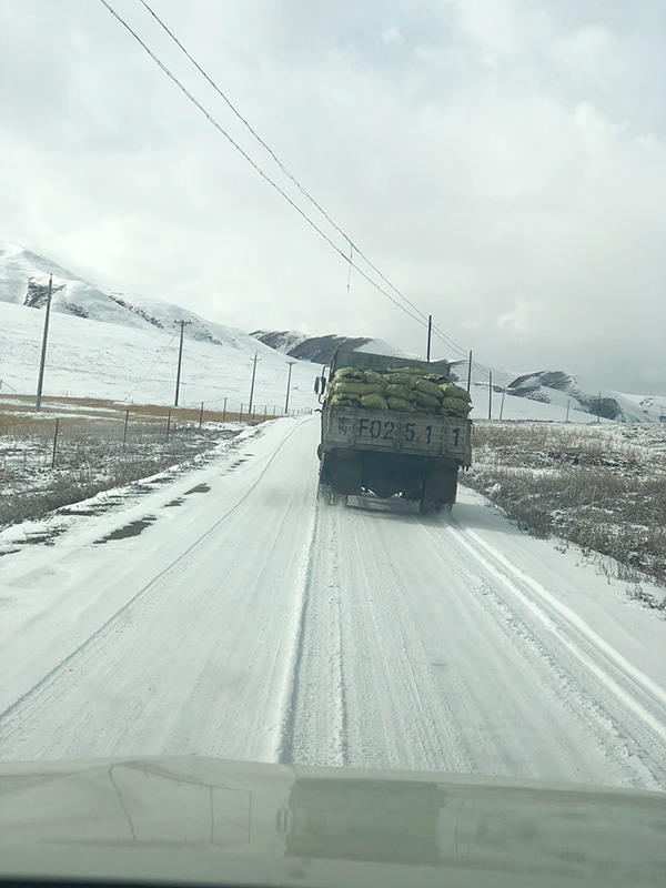 从青海玉树藏族自治州到果洛藏族自治州偏远牧区小学路程大约500公里,原本八九个小时就能到达,由于连续几天的大雪,一路都是冰雪路面,车辆行驶缓慢,满载18吨冬煤的煤车花了十几个小时还是没有到学校。