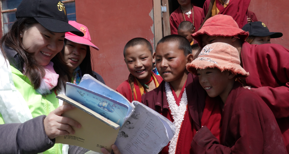 候鸟慈善青藏高原助学之旅的小朋友和格雅寺小学孩子们在开心的互动