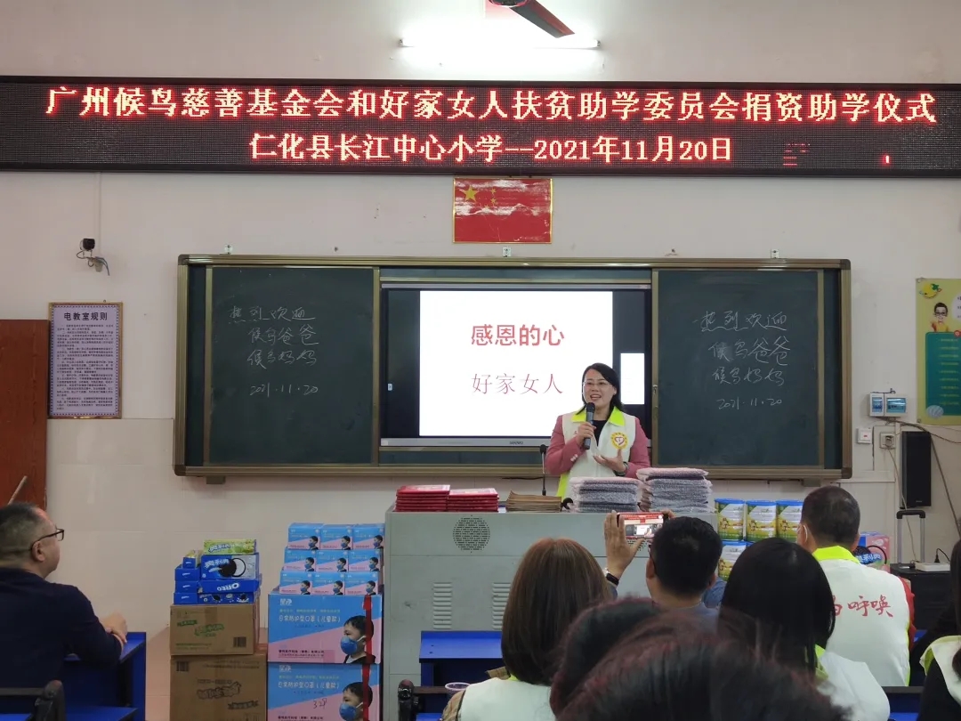 随后,仁化县乡领导,长江中心小学、里周丘超荣小学校长,候鸟慈善于勇会长,宋春燕会长,以及爱心企业代表上台为20位贫困孩子发放饼干、蛋白质粉等生活营养物资;学校领导为其颁发锦旗,县乡领导,全体志愿服务人员和20位孩子们合影留念。