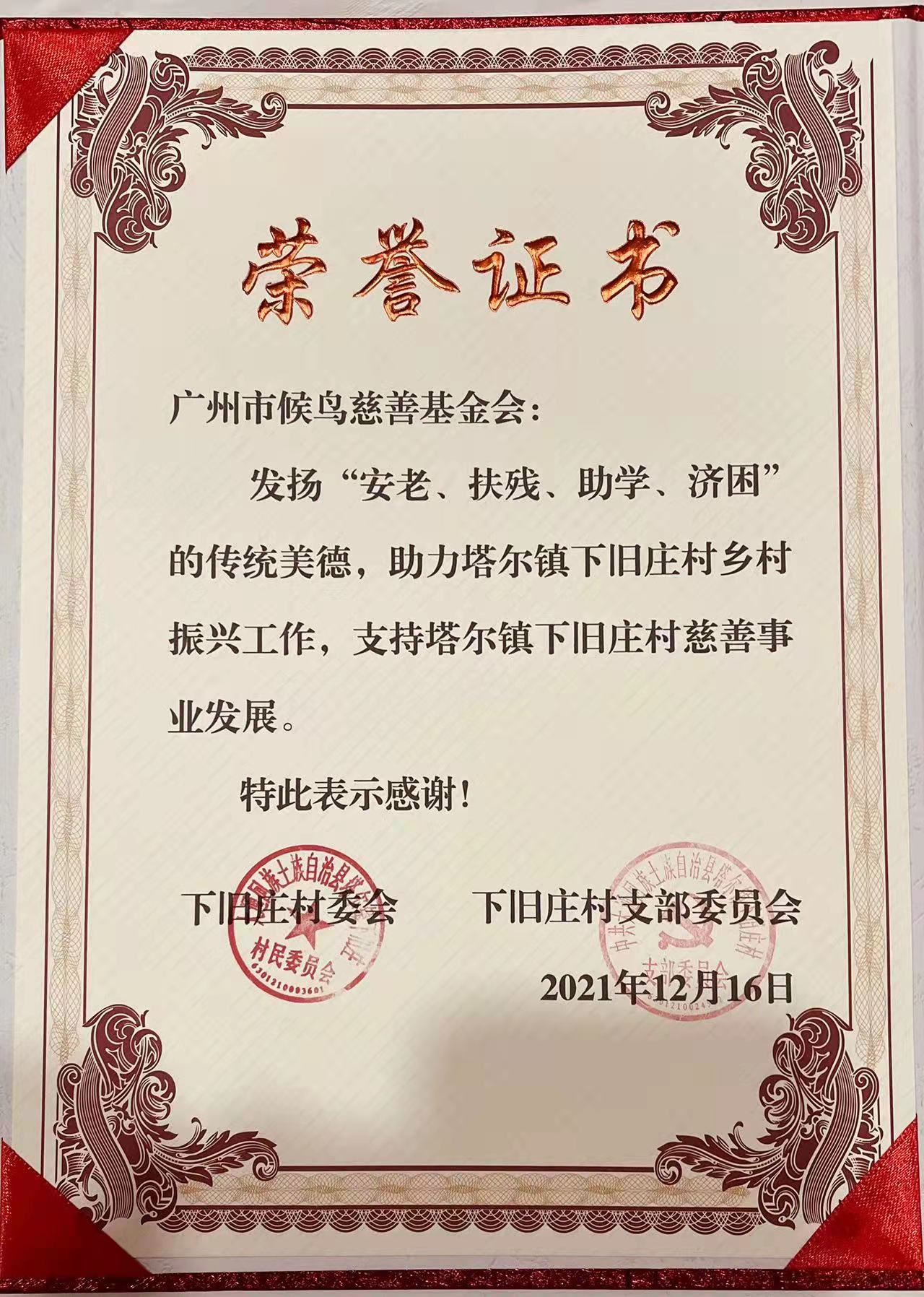 为感谢候鸟慈善基金会与爱心企业、爱心人士的捐资善举,大通县下旧庄村委会给候鸟慈善基金会颁发了荣誉证书,感谢候鸟慈善助力塔尔镇下旧庄村乡村振兴工作,支持塔尔镇下旧庄村慈善事业发展。