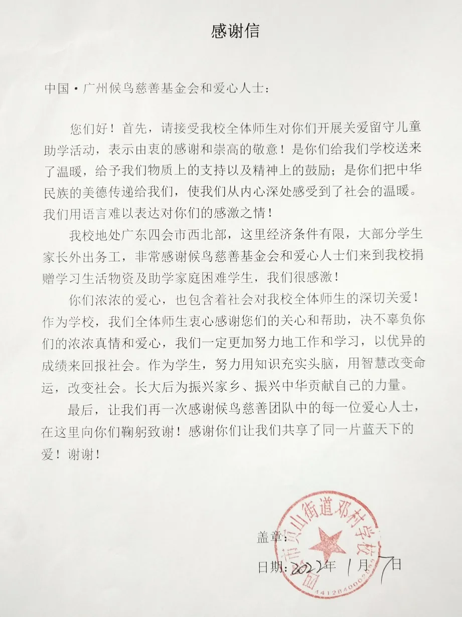 同时,四会邓村学校向候鸟慈善发来感谢信,邓村学校处于广东四会西北部,条件有限,大部分学生家长外出务工,留下孩子在家乡读书,非常感谢候鸟慈善来看望孩子们,给予孩子们物资上的支持以及精神上的鼓励。
