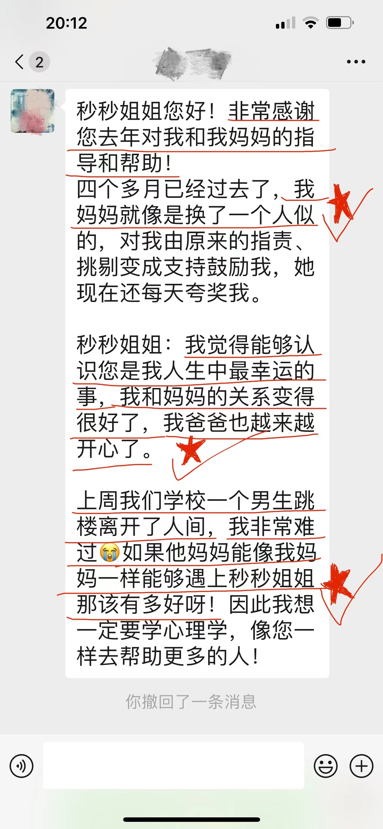 她有些崩溃的情绪。秒秒导师安慰和鼓励她马上去找到小朋友,然后单独和小朋友、家长沟通了解情况和矛盾的焦点,然后秒秒导师帮此妈妈和孩子订了一套具体的解决方案!四个月之后,秒秒导师收到这个孩子特别好的反馈。