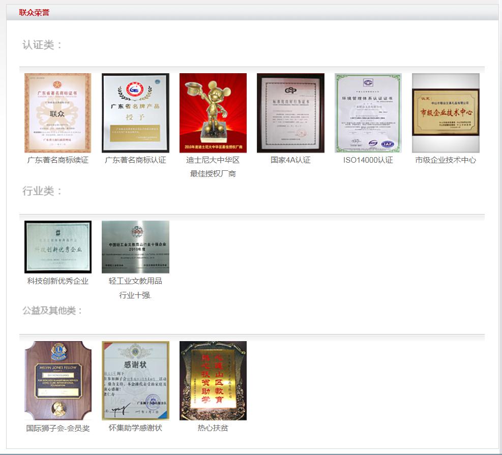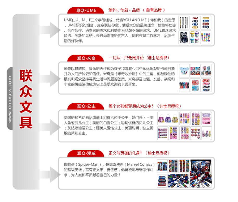 联众公司由现任总裁施红光先生创办于1996年,自成立以来,联众公司一直专注于学生、办公文具及新潮礼品的开发、设计、制造和销售。品牌包括联众UME 系列、联众出奇蛋系列及迪士尼国际授权品牌系列,内营销网络已要盖国内30个首市,并在北京、广州、上海、南京、武汉、成都、西安沈阳等城市设立了辐射全国的区域服务平台,至今发展成中国学生文具第一品牌。多次被行业协会、商会和工商管理机构授予"中国十大文具品牌"、"守合同重信用企业"、"广东首著名商标"等荣誉。