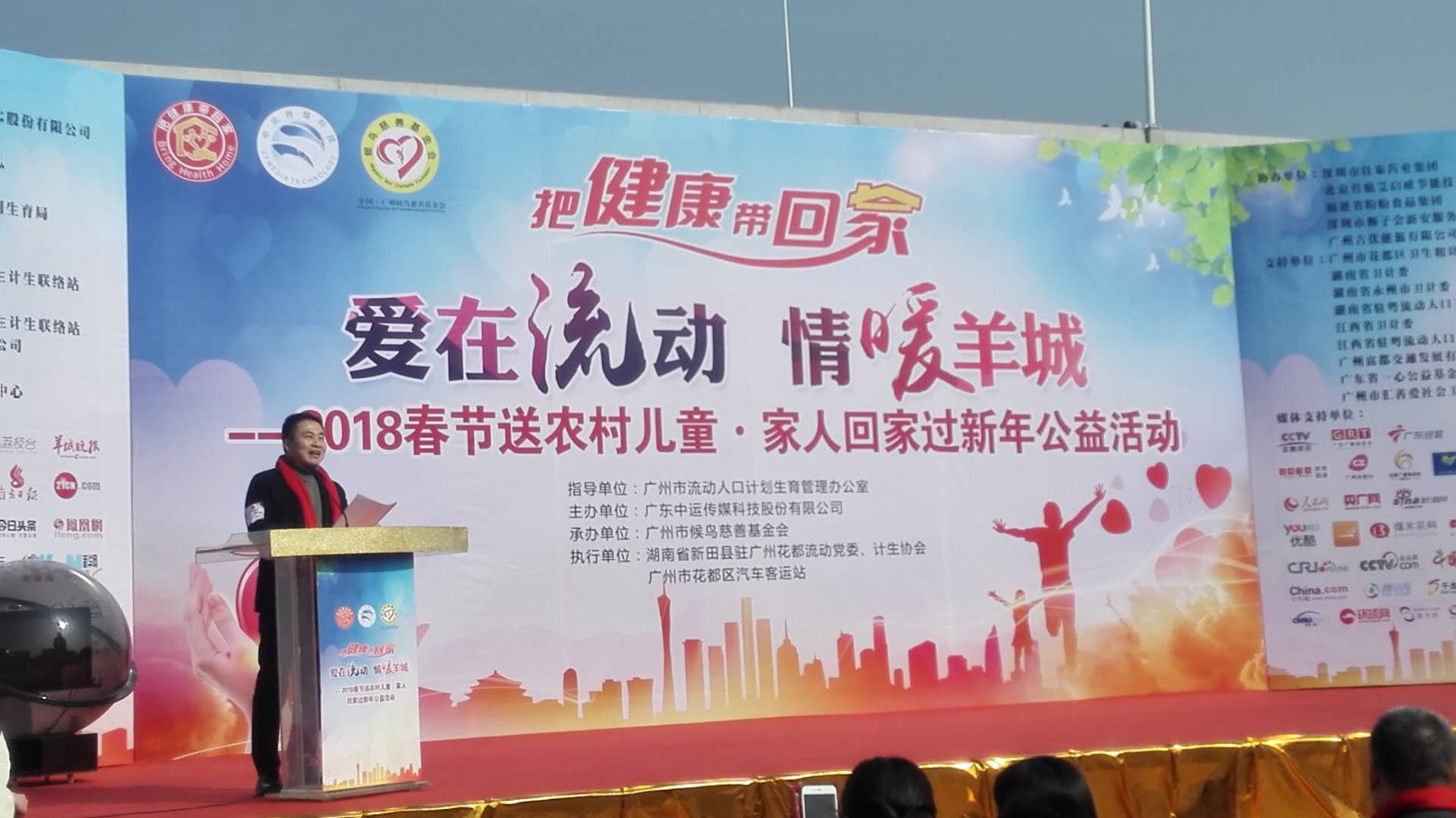 依据国家卫生和计生委办公厅、中国计划生育协会办公室下发的《关于开展“把健康带回家”流动人口卫生计生关怀关爱专项行动的通知》和广东省卫生计生委、广州市卫生计生委相关工作要求,在广州市流动人口计划生育管理办公室指导下,候鸟慈善基金会联合广东中运传媒,举办“爱在流动,情暖羊城”2018送农村留守儿童家人回家过新年大型公益活动。2018年2月8日上午9:30,本次公益活动启动仪式在广州市花都区汽车客运站拉开帷幕。