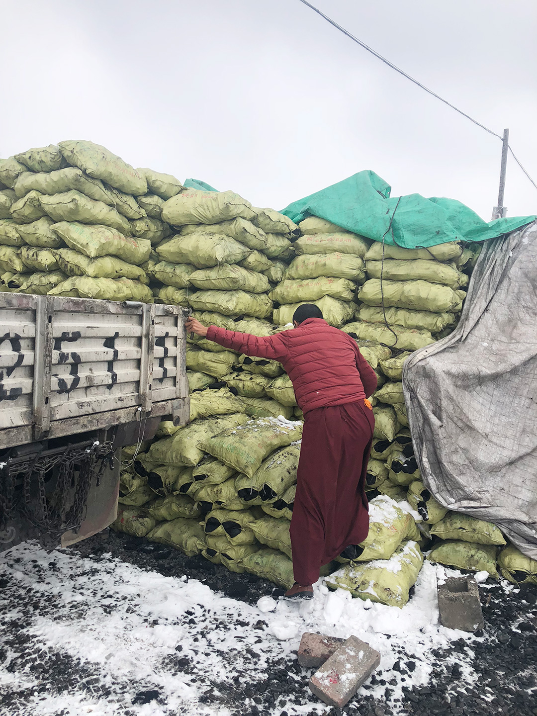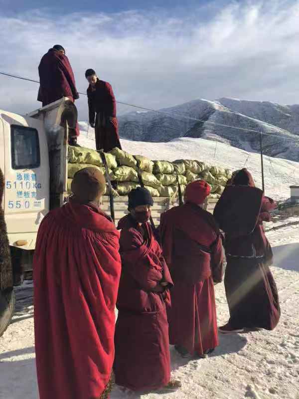 临近傍晚,冰雪越来越严重,煤车难以到达山坡上的学校,在格雅寺佛学院学生们的帮助下,把燃煤先卸在离学校两公里的山脚下……