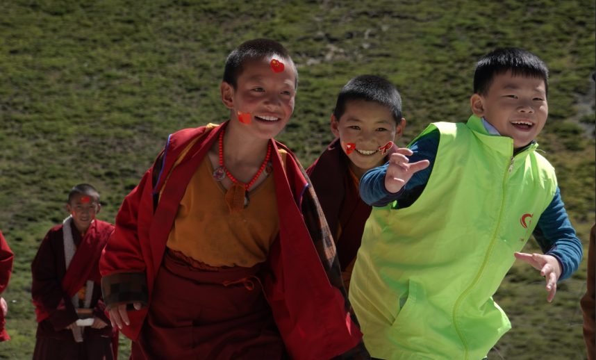 候鸟慈善青藏高原助学之旅的小朋友和格雅寺小学孩子们在开心的互动