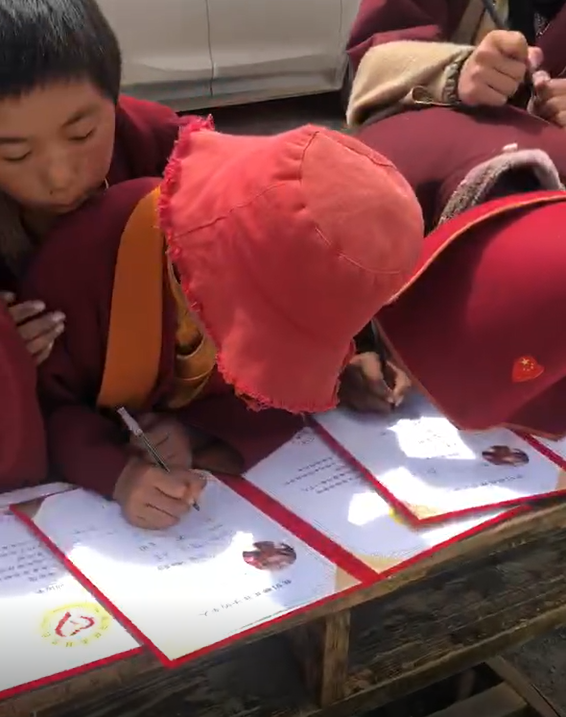 孩子们在候鸟慈善基金会为爱心人士们精心准备的证书上写下自己的名字,每一本证书将变得十分有意义,记录着助学之旅的满满爱心。